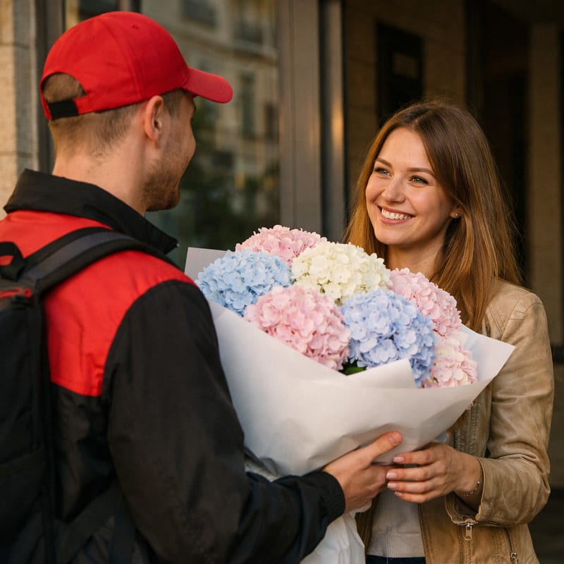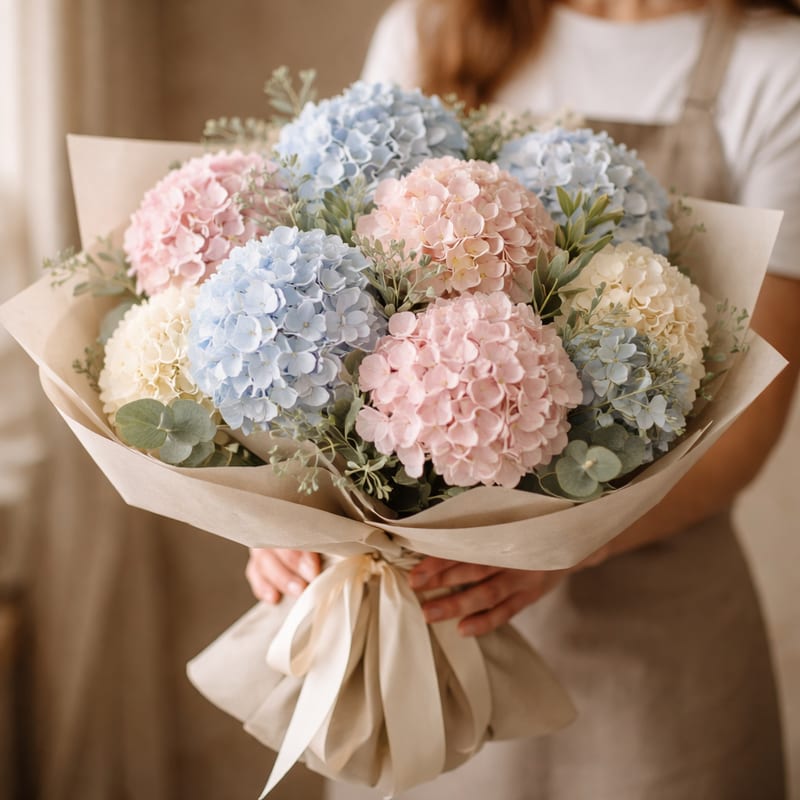 Букеты с 3 гортензиями — от 2299 руб. Миксы с розами и эустомой — 3000–4500 руб. Премиальные свадебные на 5–7 гортензиях с пионами и ранункулюсом — 4500–8000 руб. Минимум для за наш счёт доставки — 500 руб. Цены ниже летом (июль–сентябрь, сезон гортензии).