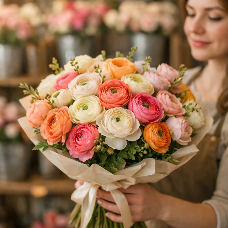 Белый, кремовый, нежно-розовый, ярко-розовый, красный, бордовый, жёлтый, оранжевый, лососёвый, двухцветные. Самые популярные для свадеб — белый и кремовый. Для романтических подарков — нежно-розовый и пудровый. Для оригинальных композиций — лососёвый и двухцветные. Ранункулюс ассорти 5 расцветок — топ для модных подарков 2026.