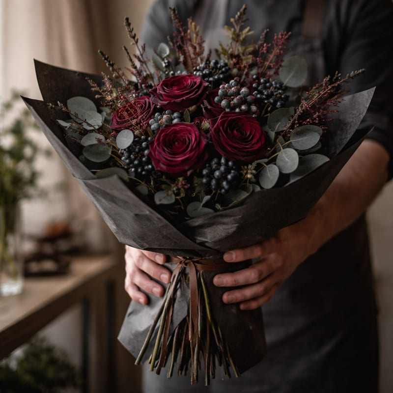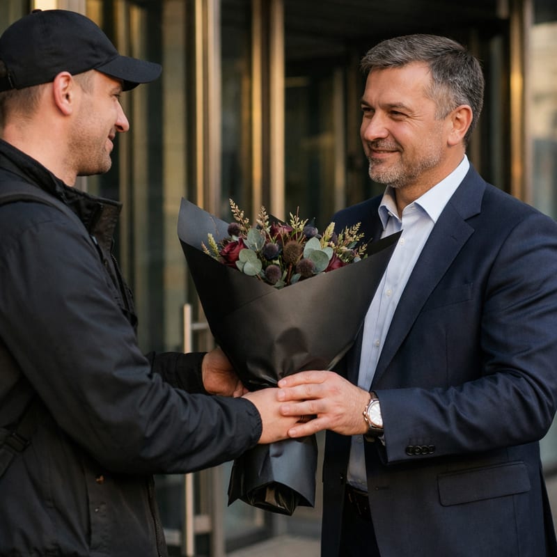 Современные позиции — строгие монобукеты из роз бордового, красного или чёрного цвета, гладиолусы, хризантемы, герберы, каллы. Избегайте розовых и пастельных оттенков, пионов и избыточного декора. Флорист составит роскошные аранжировки в мужской палитре без сладости и кружев.