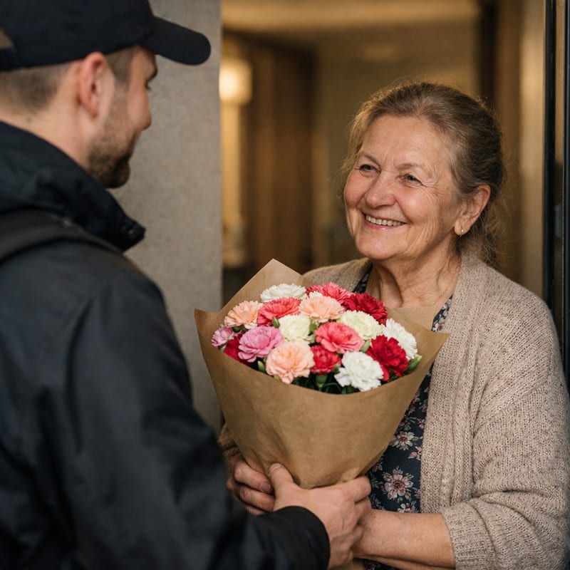 Традиция — нечётное число красных гвоздик: 3, 5, 7. Для ветерана старше 80 лет уместны 3 крупные гвоздики, чтобы не утяжелять. К мемориалу — 2 гвоздики (чётное, в память погибших). Можно добавить георгиевскую ленту. В любом случае оформляем букеты к 9 мая с символикой Победы.