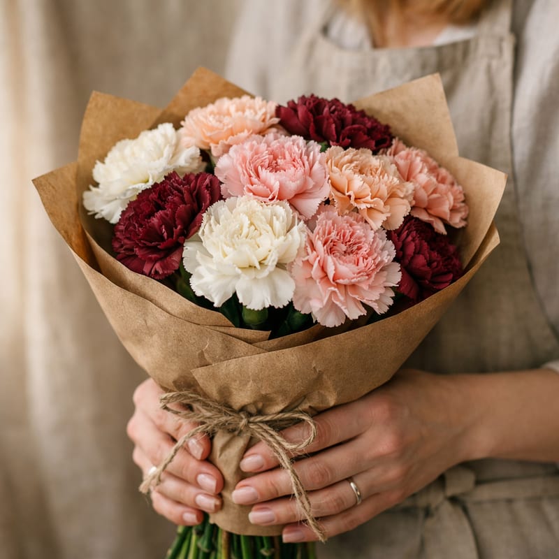 До 14 дней при правильном уходе: подрезать стебли под углом каждые 2 дня, менять воду, удалять нижние листья. Голландские гвоздики стоят дольше, чем местные. Только что срезанные цветы в любом случае с датой поставки — спросите у курьера.